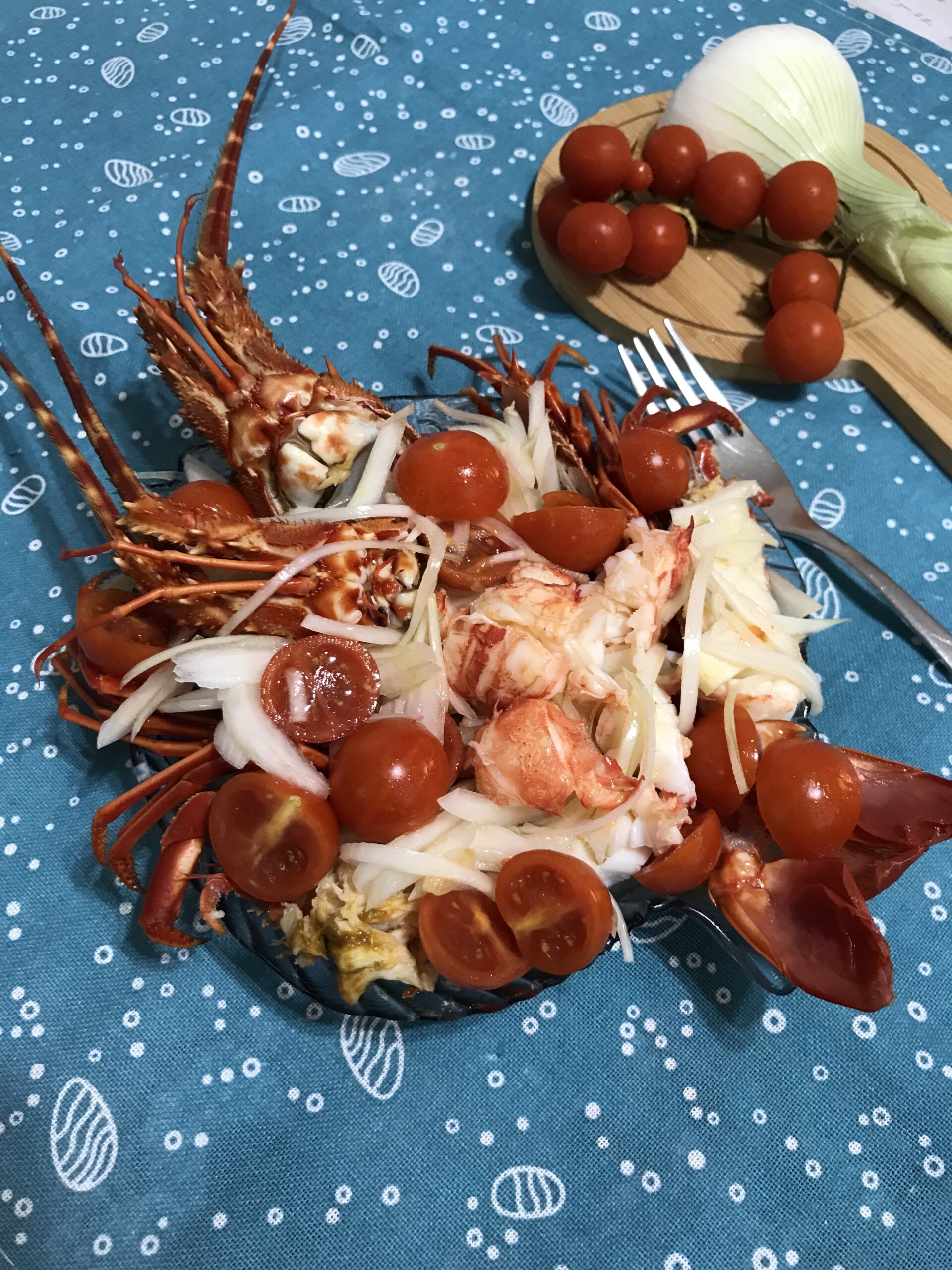 Prendiamo il piatto da portata, mettiamo la metà del condimento di cipolle e pomodorini, e adagiamo sopra tutta la polpa dell’aragosta, poi, ricopriamo la superficie con la rimanenza degli ingredienti.