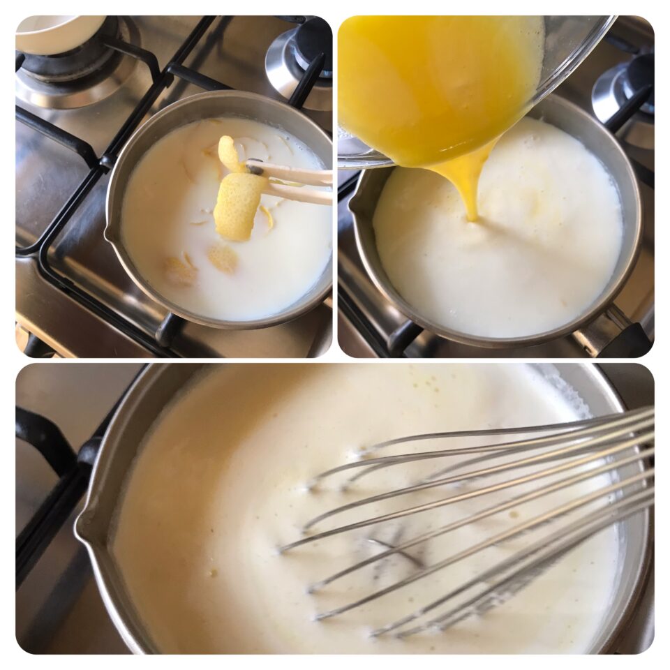 In un pentolino versiamo il latte e la scorza di limone, portiamolo sul fuoco sino a sfiorare il bollore.